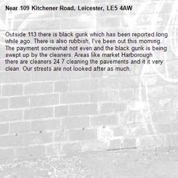 Outside 113 there is black gunk which has been reported long while ago. There is also rubbish, I've been out this morning. The payment somewhat not even and the black gunk is being swept up by the cleaners. Areas like market Harborough there are cleaners 24 7 cleaning the pavements and it it very clean. Our streets are not looked after as much.