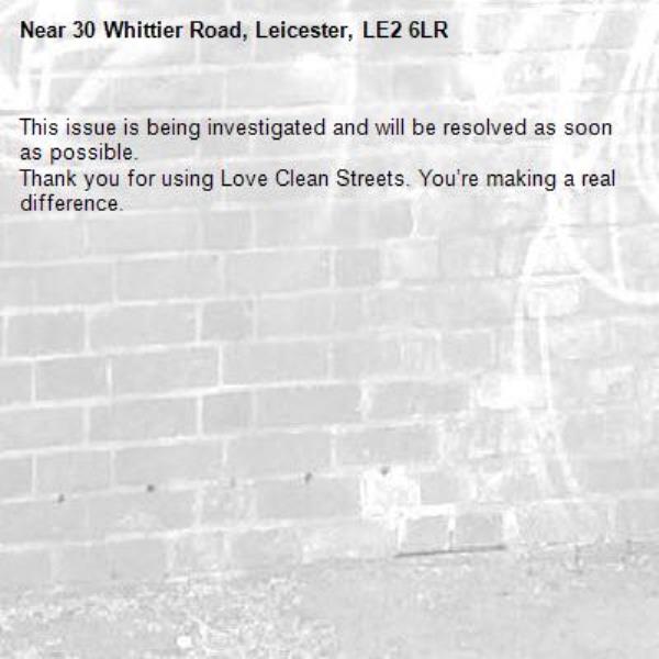 -30 Whittier Road, Leicester, LE2 6LR 09/03/2026 08:56 This issue is being investigated and will be resolved as soon as possible. Thank you for using Love Clean Streets. You’re making a real difference.