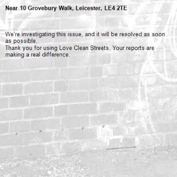 -10 Grovebury Walk, Leicester, LE4 2TE 16/10/2025 09:47 We’re investigating this issue, and it will be resolved as soon as possible. Thank you for using Love Clean Streets. Your reports are making a real difference.