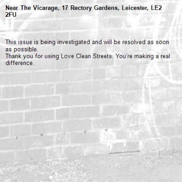 -The Vicarage, 17 Rectory Gardens, Leicester, LE2 2FU 23/04/2026 07:47 This issue is being investigated and will be resolved as soon as possible. Thank you for using Love Clean Streets. You’re making a real difference.