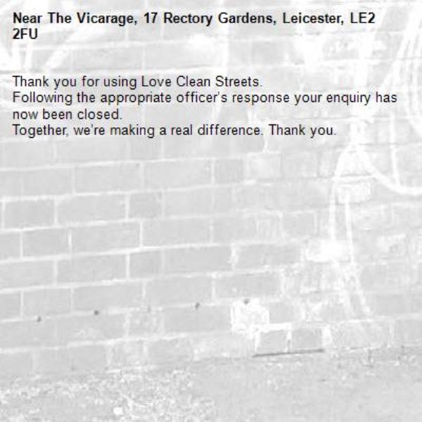 -The Vicarage, 17 Rectory Gardens, Leicester, LE2 2FU 23/04/2026 08:32 Thank you for using Love Clean Streets.
