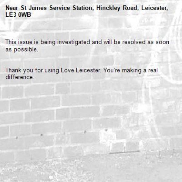 -St James Service Station, Hinckley Road, Leicester, LE3 0WB 07/02/2026 09:06 This issue is being investigated and will be resolved as soon as possible. Thank you for using Love Leicester. You’re making a real difference.
