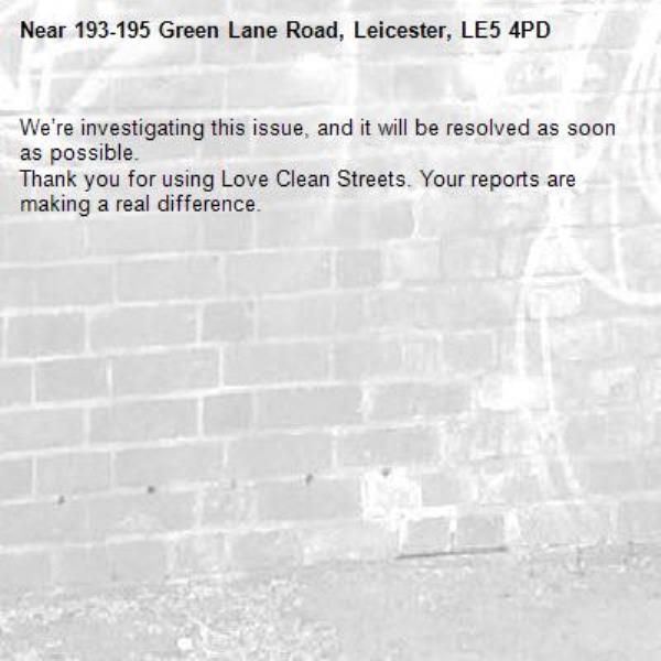 -193-195 Green Lane Road, Leicester, LE5 4PD 04/04/2026 10:56 We’re investigating this issue, and it will be resolved as soon as possible. Thank you for using Love Clean Streets. Your reports are making a real difference.