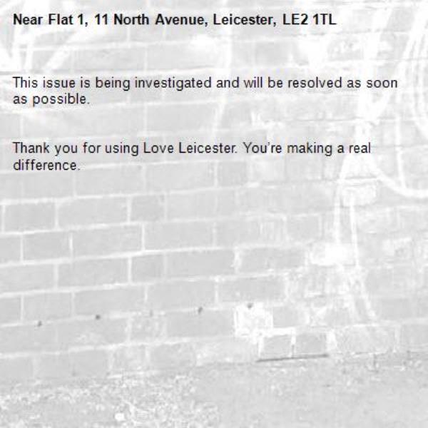-Flat 1, 11 North Avenue, Leicester, LE2 1TL 20/04/2026 16:06 This issue is being investigated and will be resolved as soon as possible. Thank you for using Love Leicester. You’re making a real difference.