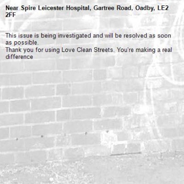 -Spire Leicester Hospital, Gartree Road, Oadby, LE2 2FF 31/03/2026 11:18 This issue is being investigated and will be resolved as soon as possible. Thank you for using Love Clean Streets. You’re making a real difference