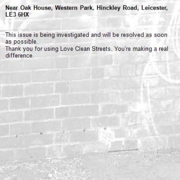 -Oak House, Western Park, Hinckley Road, Leicester, LE3 6HX 18/02/2026 09:52 This issue is being investigated and will be resolved as soon as possible. Thank you for using Love Clean Streets. You’re making a real difference.