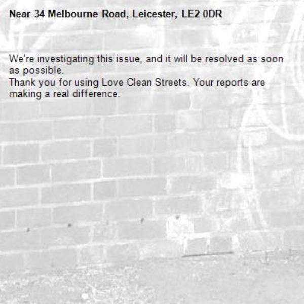 -34 Melbourne Road, Leicester, LE2 0DR 16/04/2026 10:05 We’re investigating this issue, and it will be resolved as soon as possible. Thank you for using Love Clean Streets. Your reports are making a real difference.