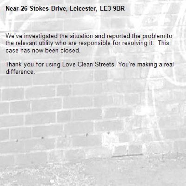 -26 Stokes Drive, Leicester, LE3 9BR 14/04/2026 09:42 We’ve investigated the situation and reported the problem to the relevant utility who are responsible for resolving it. This case has now been closed. Thank you for using Love Clean Streets. You’re making a real difference.