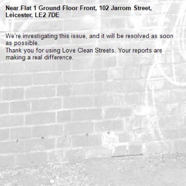 -Flat 1 Ground Floor Front, 102 Jarrom Street, Leicester, LE2 7DE 16/03/2026 14:00 We’re investigating this issue, and it will be resolved as soon as possible. Thank you for using Love Clean Streets. Your reports are making a real difference.
