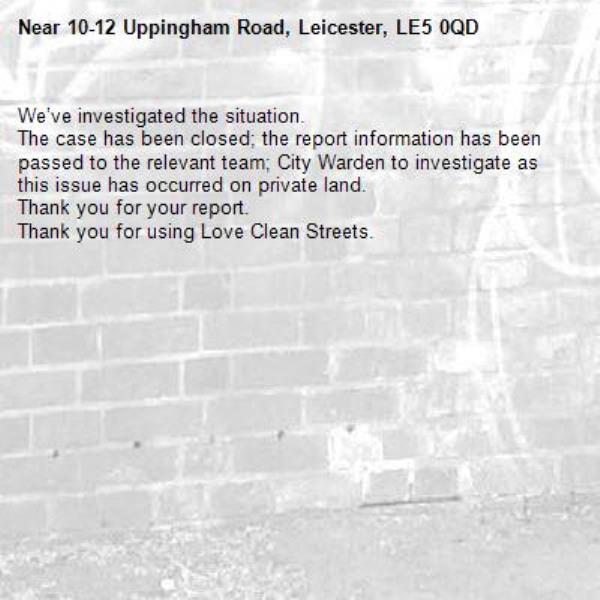 The case has been closed; the report information has been passed to the relevant team; City Warden to investigate as this issue has occurred on private land.