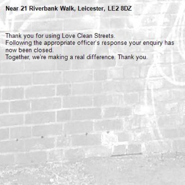 -21 Riverbank Walk, Leicester, LE2 8DZ 23/04/2026 07:31 Thank you for using Love Clean Streets.