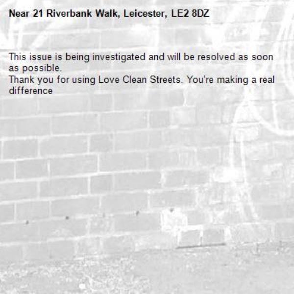 -21 Riverbank Walk, Leicester, LE2 8DZ 23/04/2026 07:30 This issue is being investigated and will be resolved as soon as possible. Thank you for using Love Clean Streets. You’re making a real difference