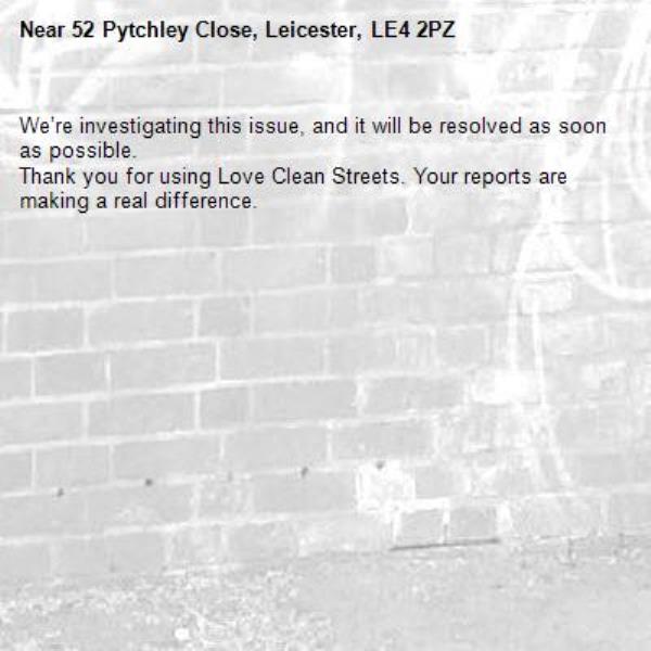 -52 Pytchley Close, Leicester, LE4 2PZ 01/12/2025 09:43 We’re investigating this issue, and it will be resolved as soon as possible. Thank you for using Love Clean Streets. Your reports are making a real difference.