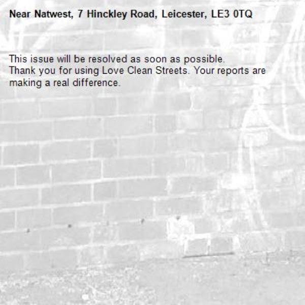 -Natwest, 7 Hinckley Road, Leicester, LE3 0TQ 17/11/2025 09:07 This issue will be resolved as soon as possible. Thank you for using Love Clean Streets. Your reports are making a real difference.