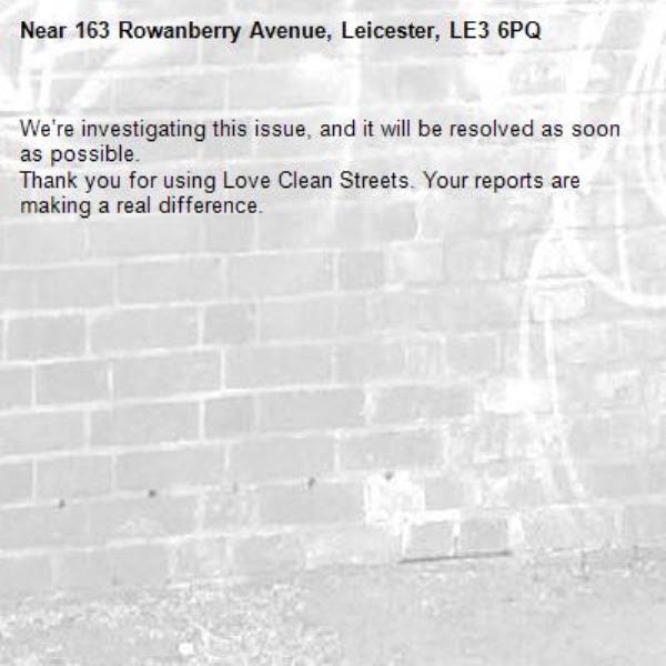 -163 Rowanberry Avenue, Leicester, LE3 6PQ 24/11/2025 13:14 We’re investigating this issue, and it will be resolved as soon as possible. Thank you for using Love Clean Streets. Your reports are making a real difference.