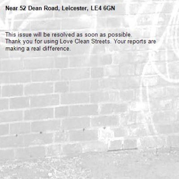 -52 Dean Road, Leicester, LE4 6GN 13/01/2026 07:24 This issue will be resolved as soon as possible. Thank you for using Love Clean Streets. Your reports are making a real difference.