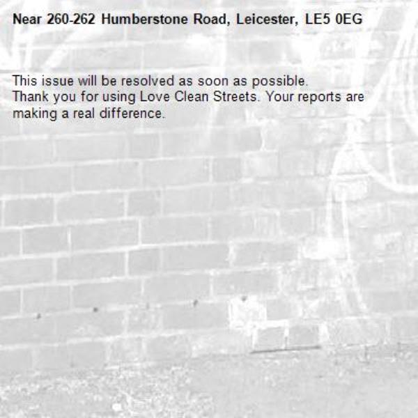 -260-262 Humberstone Road, Leicester, LE5 0EG 01/04/2026 08:08 This issue will be resolved as soon as possible. Thank you for using Love Clean Streets. Your reports are making a real difference.