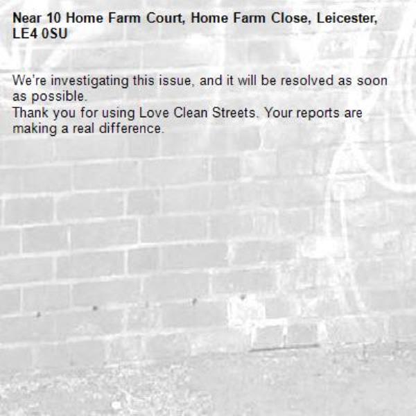 -10 Home Farm Court, Home Farm Close, Leicester, LE4 0SU 25/11/2025 09:57 We’re investigating this issue, and it will be resolved as soon as possible. Thank you for using Love Clean Streets. Your reports are making a real difference.