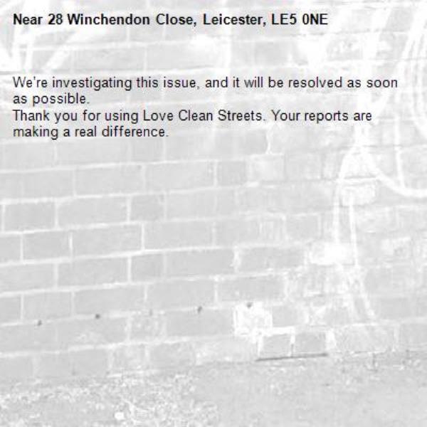 -28 Winchendon Close, Leicester, LE5 0NE 26/02/2026 09:23 We’re investigating this issue, and it will be resolved as soon as possible. Thank you for using Love Clean Streets. Your reports are making a real difference.