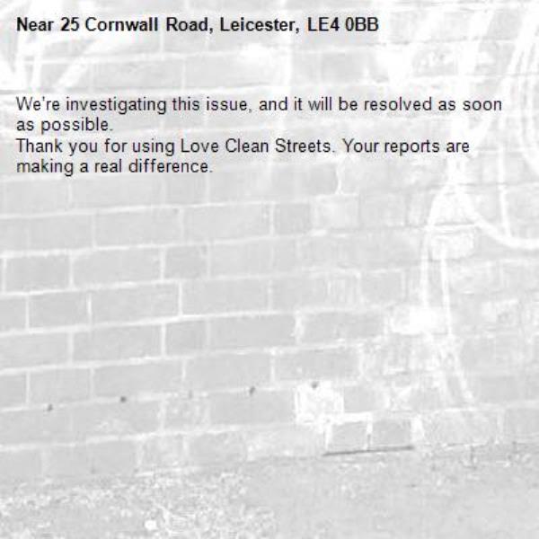 -25 Cornwall Road, Leicester, LE4 0BB 05/04/2026 11:00 We’re investigating this issue, and it will be resolved as soon as possible. Thank you for using Love Clean Streets. Your reports are making a real difference.