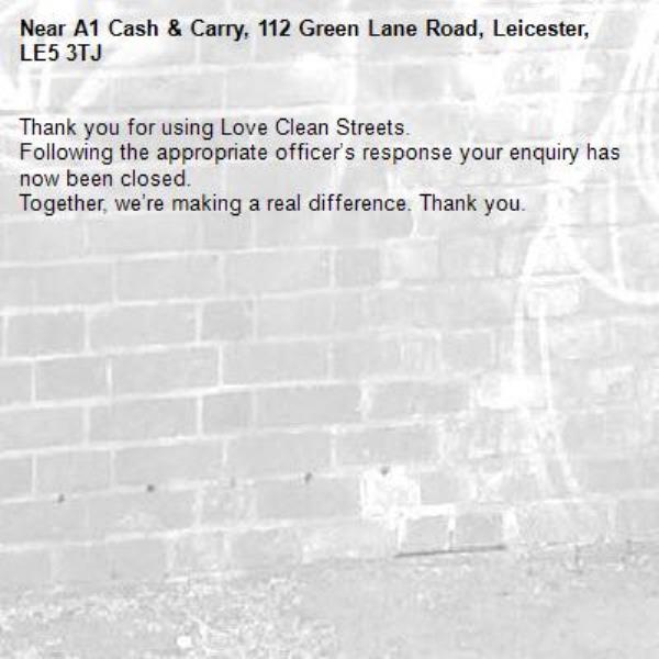 -A1 Cash & Carry, 112 Green Lane Road, Leicester, LE5 3TJ 12/02/2026 15:37 Thank you for using Love Clean Streets.