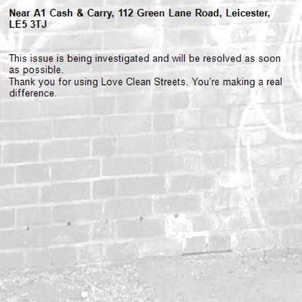 -A1 Cash & Carry, 112 Green Lane Road, Leicester, LE5 3TJ 12/02/2026 14:05 This issue is being investigated and will be resolved as soon as possible. Thank you for using Love Clean Streets. You’re making a real difference.