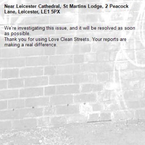 -Leicester Cathedral, St Martins Lodge, 2 Peacock Lane, Leicester, LE1 5PX 06/01/2026 13:13 We’re investigating this issue, and it will be resolved as soon as possible. Thank you for using Love Clean Streets. Your reports are making a real difference.