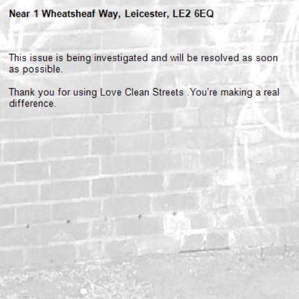 -1 Wheatsheaf Way, Leicester, LE2 6EQ 08/12/2025 13:54 This issue is being investigated and will be resolved as soon as possible. Thank you for using Love Clean Streets .You’re making a real difference.
