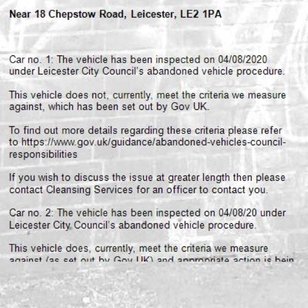 Two cars believe to be dumped on Chepstow road. When checked one car had no tax and one had no MOT. Been there from March, since before lockdown.