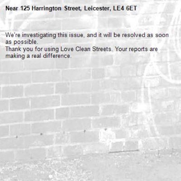 -125 Harrington Street, Leicester, LE4 6ET 13/03/2026 07:55 We’re investigating this issue, and it will be resolved as soon as possible. Thank you for using Love Clean Streets. Your reports are making a real difference.