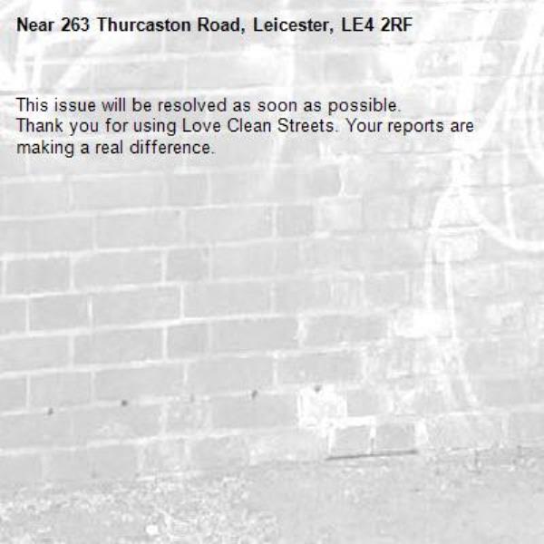 -263 Thurcaston Road, Leicester, LE4 2RF 16/04/2026 07:25 This issue will be resolved as soon as possible. Thank you for using Love Clean Streets. Your reports are making a real difference.