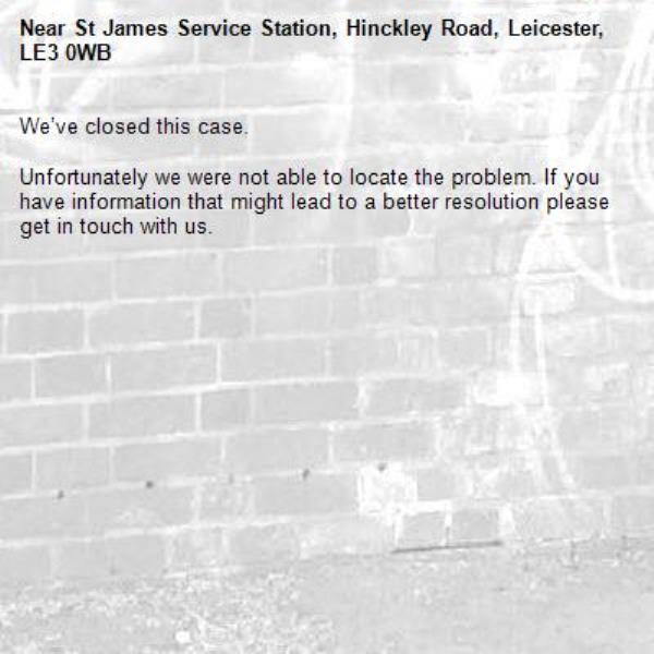 -St James Service Station, Hinckley Road, Leicester, LE3 0WB 02/03/2026 10:22 We’ve closed this case. Unfortunately we were not able to locate the problem. If you have information that might lead to a better resolution please get in touch with us.