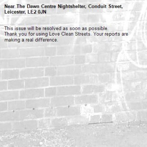 -The Dawn Centre Nightshelter, Conduit Street, Leicester, LE2 0JN 04/04/2026 10:54 This issue will be resolved as soon as possible. Thank you for using Love Clean Streets. Your reports are making a real difference.