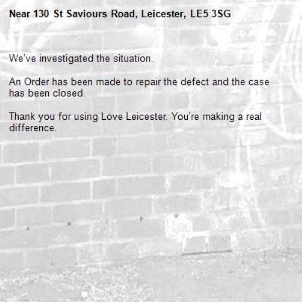 -130 St Saviours Road, Leicester, LE5 3SG 25/02/2026 15:32 We’ve investigated the situation. An Order has been made to repair the defect and the case has been closed. Thank you for using Love Leicester. You’re making a real difference.