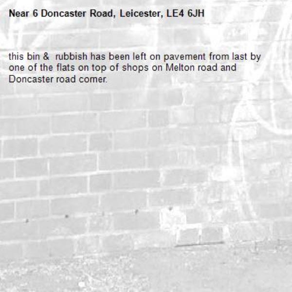 this bin & rubbish has been left on pavement from last by one of the flats on top of shops on Melton road and Doncaster road corner.