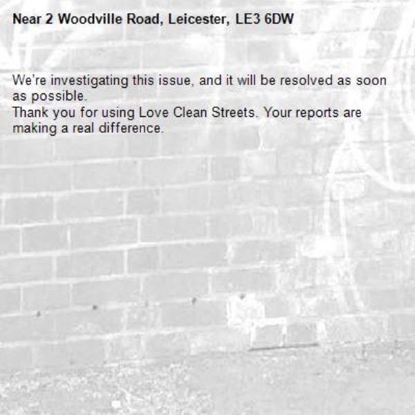-2 Woodville Road, Leicester, LE3 6DW 23/02/2026 09:13 We’re investigating this issue, and it will be resolved as soon as possible. Thank you for using Love Clean Streets. Your reports are making a real difference.
