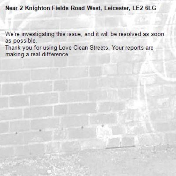 -2 Knighton Fields Road West, Leicester, LE2 6LG 09/03/2026 13:03 We’re investigating this issue, and it will be resolved as soon as possible. Thank you for using Love Clean Streets. Your reports are making a real difference.