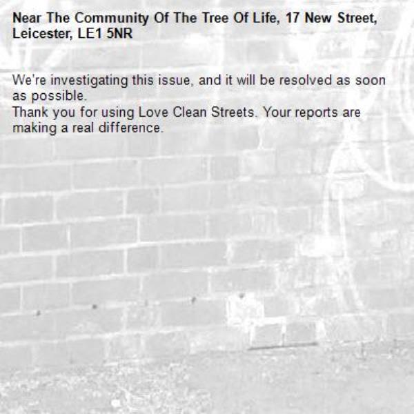 -The Community Of The Tree Of Life, 17 New Street, Leicester, LE1 5NR 09/12/2025 09:40 We’re investigating this issue, and it will be resolved as soon as possible. Thank you for using Love Clean Streets. Your reports are making a real difference.
