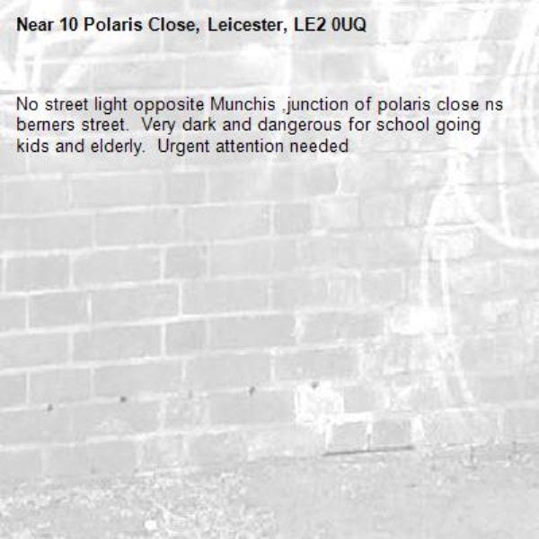 No street light opposite Munchis ,junction of polaris close ns berners street. Very dark and dangerous for school going kids and elderly. Urgent attention needed