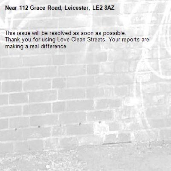 -112 Grace Road, Leicester, LE2 8AZ 27/03/2026 08:06 This issue will be resolved as soon as possible. Thank you for using Love Clean Streets. Your reports are making a real difference.