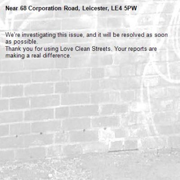 -68 Corporation Road, Leicester, LE4 5PW 02/02/2026 13:52 We’re investigating this issue, and it will be resolved as soon as possible. Thank you for using Love Clean Streets. Your reports are making a real difference.