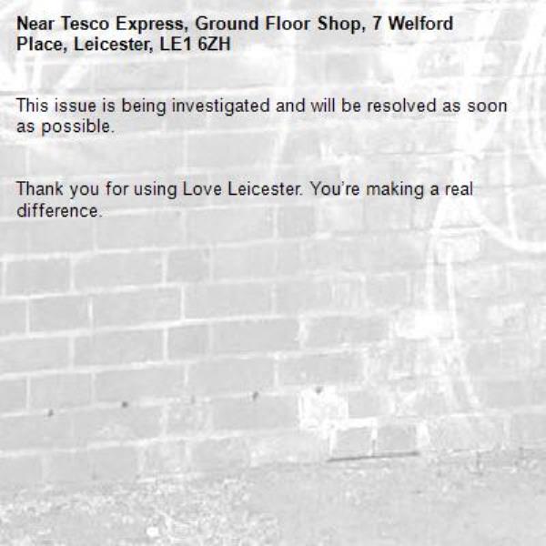 -Tesco Express, Ground Floor Shop, 7 Welford Place, Leicester, LE1 6ZH 04/03/2026 11:30 This issue is being investigated and will be resolved as soon as possible. Thank you for using Love Leicester. You’re making a real difference.