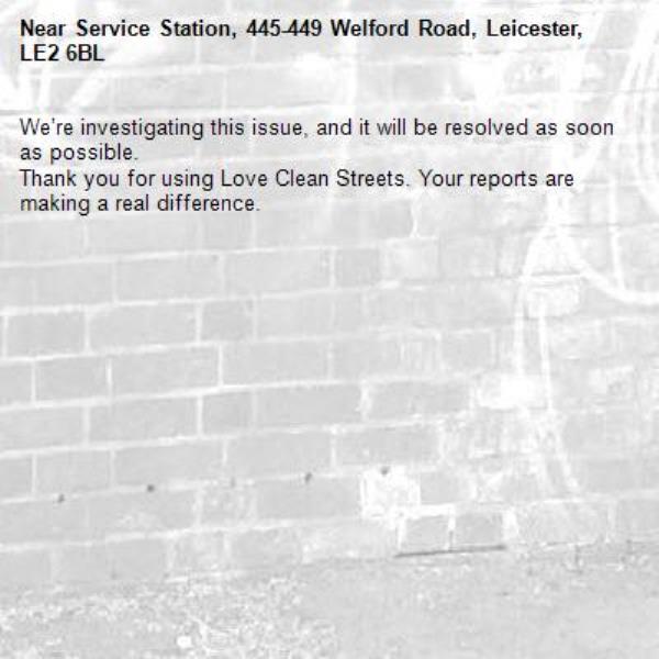 -Service Station, 445-449 Welford Road, Leicester, LE2 6BL 20/03/2026 13:20 We’re investigating this issue, and it will be resolved as soon as possible. Thank you for using Love Clean Streets. Your reports are making a real difference.