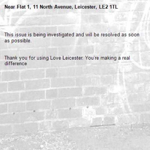 -Flat 1, 11 North Avenue, Leicester, LE2 1TL 06/02/2026 09:26 This issue is being investigated and will be resolved as soon as possible. Thank you for using Love Leicester. You’re making a real difference