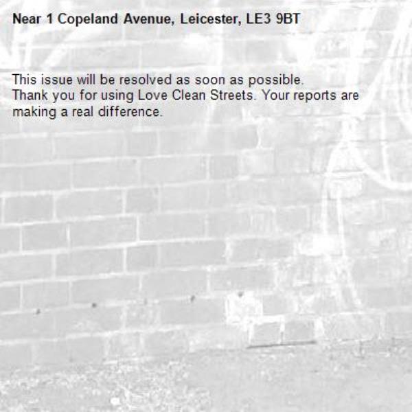 -1 Copeland Avenue, Leicester, LE3 9BT 04/03/2026 07:49 This issue will be resolved as soon as possible. Thank you for using Love Clean Streets. Your reports are making a real difference.