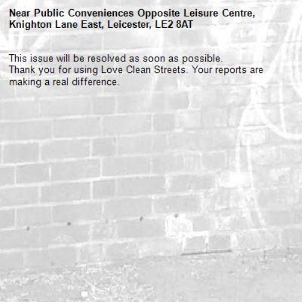 -Public Conveniences Opposite Leisure Centre, Knighton Lane East, Leicester, LE2 8AT 10/04/2026 09:21 This issue will be resolved as soon as possible. Thank you for using Love Clean Streets. Your reports are making a real difference.