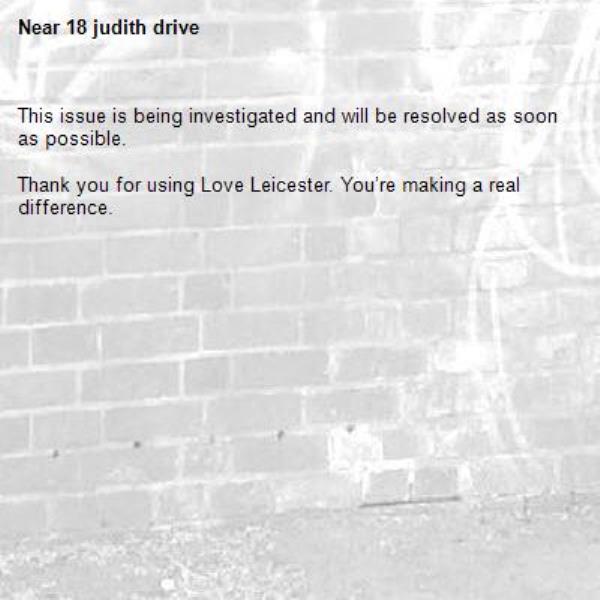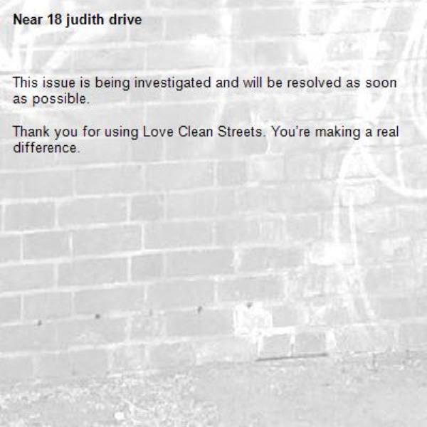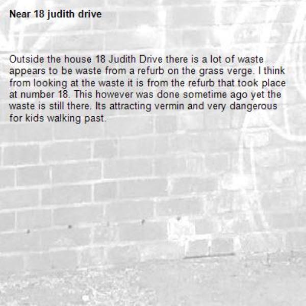 Outside the house 18 Judith Drive there is a lot of waste appears to be waste from a refurb on the grass verge. I think from looking at the waste it is from the refurb that took place at number 18. This however was done sometime ago yet the waste is still there. Its attracting vermin and very dangerous for kids walking past.