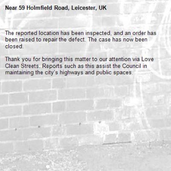 The reported location has been inspected, and an order has been raised to repair the defect. The case has now been closed.