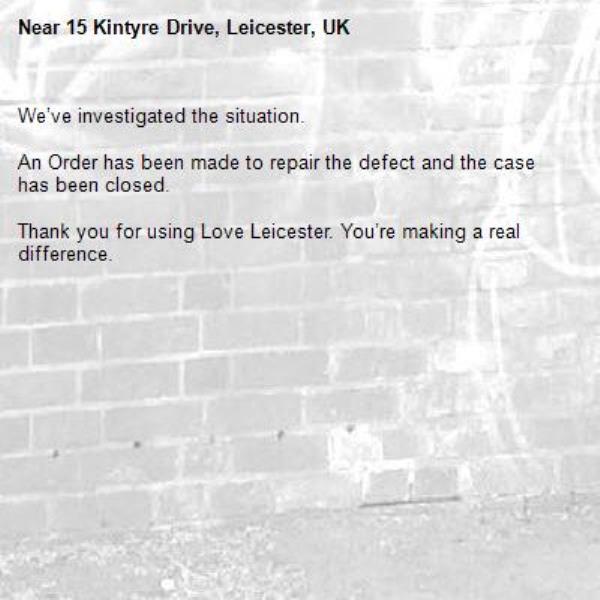 -15 Kintyre Drive, Leicester, UK 17/12/2025 15:48 We’ve investigated the situation. An Order has been made to repair the defect and the case has been closed. Thank you for using Love Leicester. You’re making a real difference.