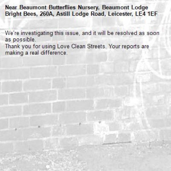 -Beaumont Butterflies Nursery, Beaumont Lodge Bright Bees, 260A, Astill Lodge Road, Leicester, LE4 1EF 03/03/2026 10:04 We’re investigating this issue, and it will be resolved as soon as possible. Thank you for using Love Clean Streets. Your reports are making a real difference.